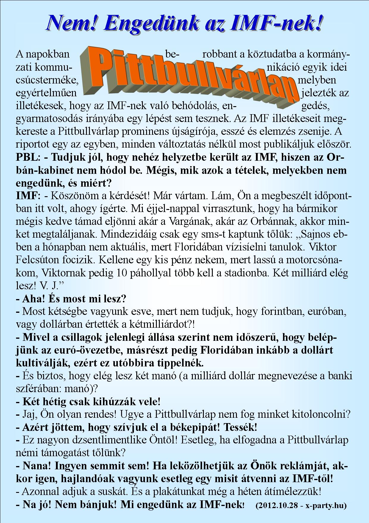 1.) mert Gaudi nagy Ta más a május 16-i parlamenti felszólalásában túl enyhe hangnemben kritizálta az elmúlt nyolc évet, a szocio-bolsi-libsi-komcsi-nárcisz időszakot. "Üvöltöznöd kellett volna, csapkodnod a pulpitust! És mi az, hogy alig habzott a szájad? Talán nics elég borotvahab a családban? Azt rohadt, korhadt penészséget!" Gaudi Nagy Ta más pedig pislogva, arca pirulva vette az adást, nem mert ellenszólni, mert akkor végleg elesik a beigért bárói címtől. 2.) mert Orbán Viktor elengedte Schmitt kezét. Ezek után két Jobbikos huszár megdobálta rohadt paradicsommal a Satkányt. Na ekkor indult el a pokolba Satkány, de odaszólt Viktorhoz: "Meglásd Viktor, két hónap, és követni fogsz!" 3.) mert nagy ívben le lett festékezve vitéz Nagy és Kisbányai Felsőlacházi Alsófelcsúti Horthy Mikolausz szobra. Pfúj! |