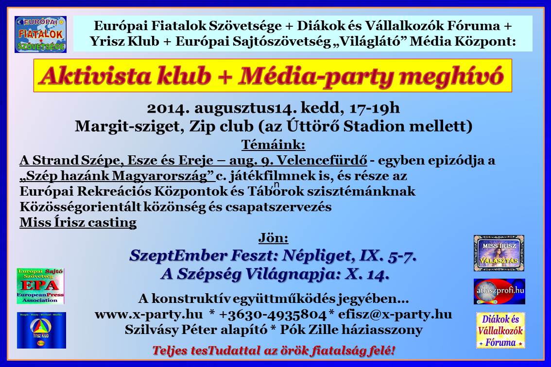 Megállapodás: a szeptember 12-i Before partin nagyszabású, különleges Médiapartit is celebrálunk. Sajtóasztalok és programbörze lesz. Bevezetjük a rendezvény auditálás módszerét is. A szépségversenyünk castingját is sikerült jól megvalósítanunk.