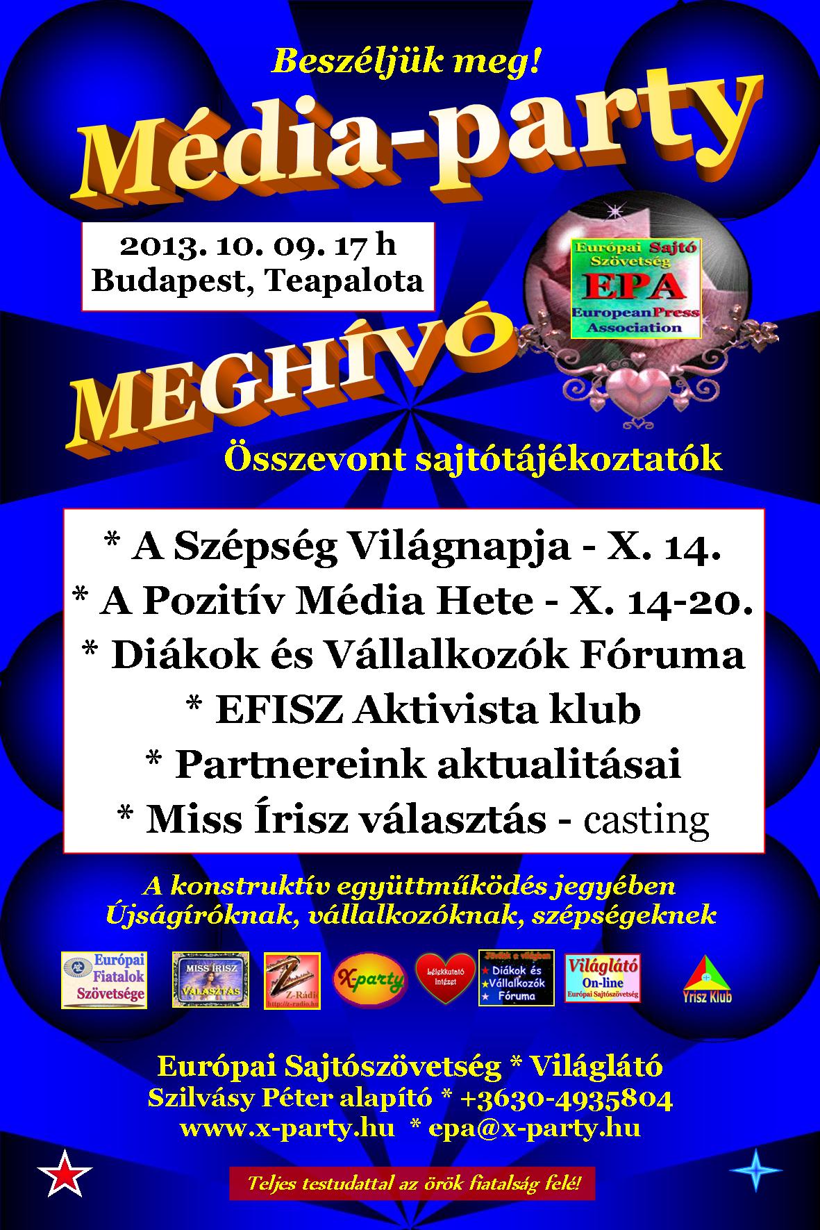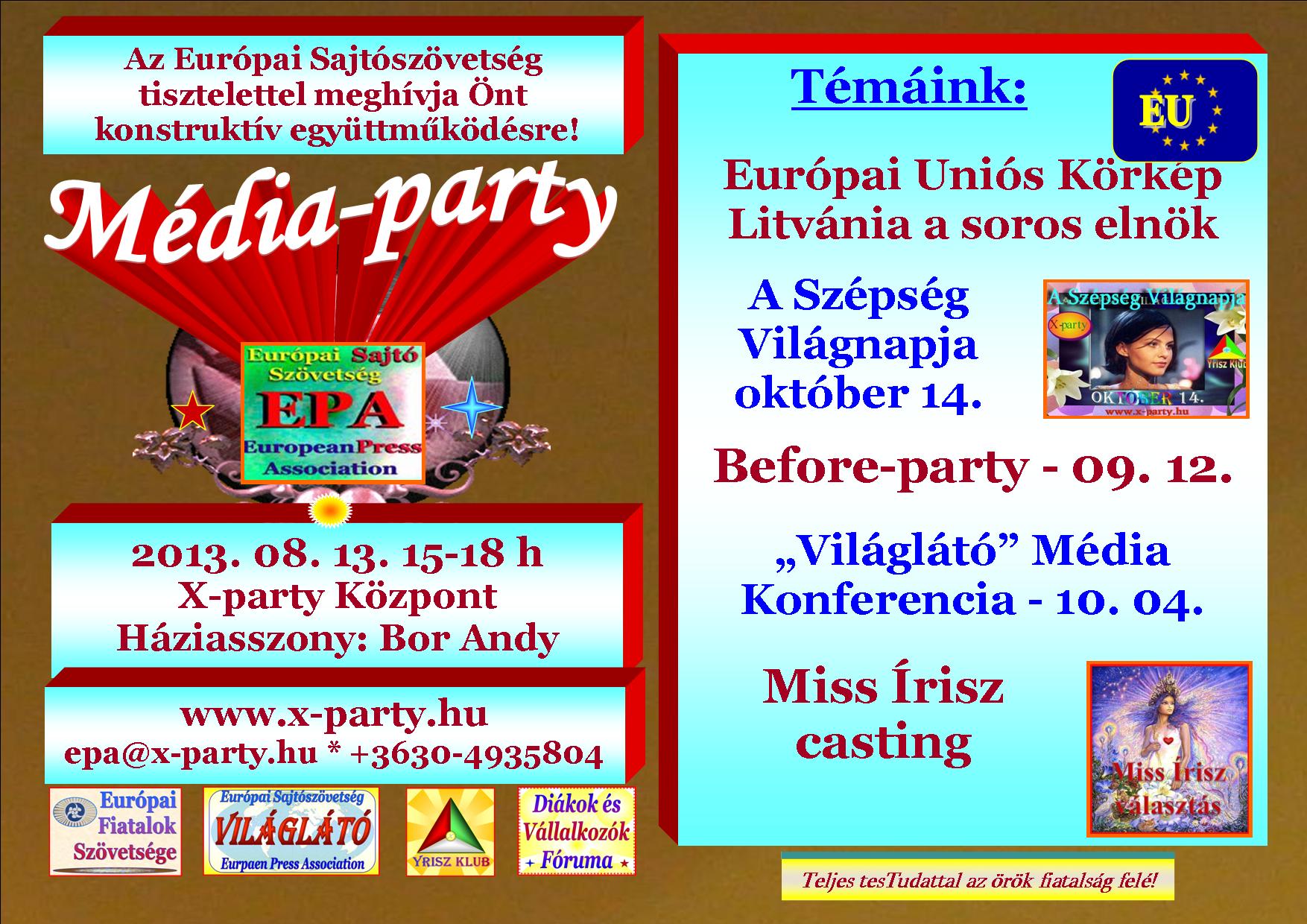 A médiapartik rendszerét sikeresen kifejlesztettük. Bebizonyosodott, hogy az összefogásnak van jövője. Az Európai sajtószövetség alapelve a konstruktív együttműködés jegyében a Média-partijainkat lazább rendezvénnyel is kombináljuk. A meghívottak körét bővítjük: a különleges, jó termékek előállítóit is hívjuk, az on-line média guruit is, a nemzetközi média hazai képviselőit és nagyon fontosan a diákújságírókat is.
